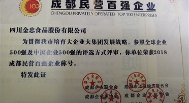 金忠食品喜獲2018成都民營(yíng)百?gòu)?qiáng)企業(yè)、制造業(yè)百?gòu)?qiáng)企業(yè)稱號(hào)